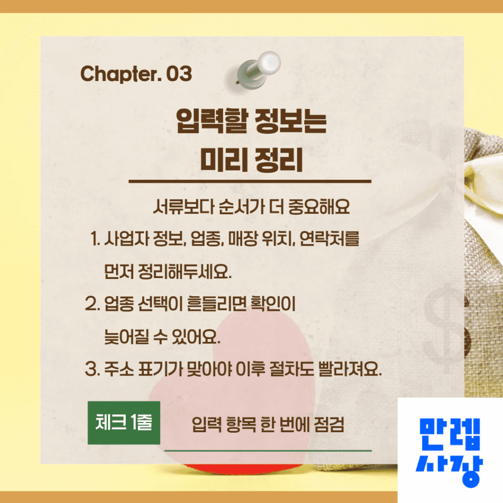 업종 선택과 사업장 주소 표기가 흔들리면 확인 절차가 지연될 수 있으므로 사전 정리가 중요합니다.
