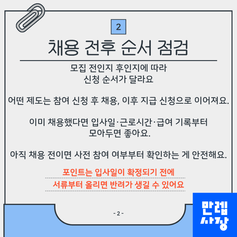 빠르게 진행하려면 “목적 분류 → 채용 전후 구분 → 청년 일정 고정 → 고용24 입력 정합성 점검 → 서류 3묶음 정리 → 반려 요소 점검” 순서가 가장 안정적입니다.