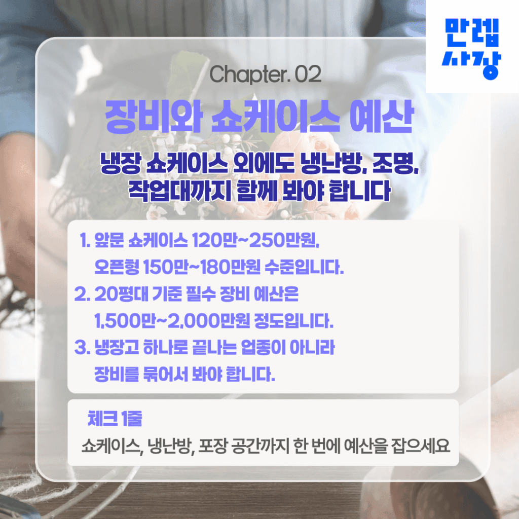 앞문 쇼케이스가 120만~250만원, 오픈형이 150만~180만원 수준이며, 20평대 기준 쇼케이스와 냉난방기, 조명 같은 필수 장비 예산은 1,500만~2,000만원 정도가 필요합니다.