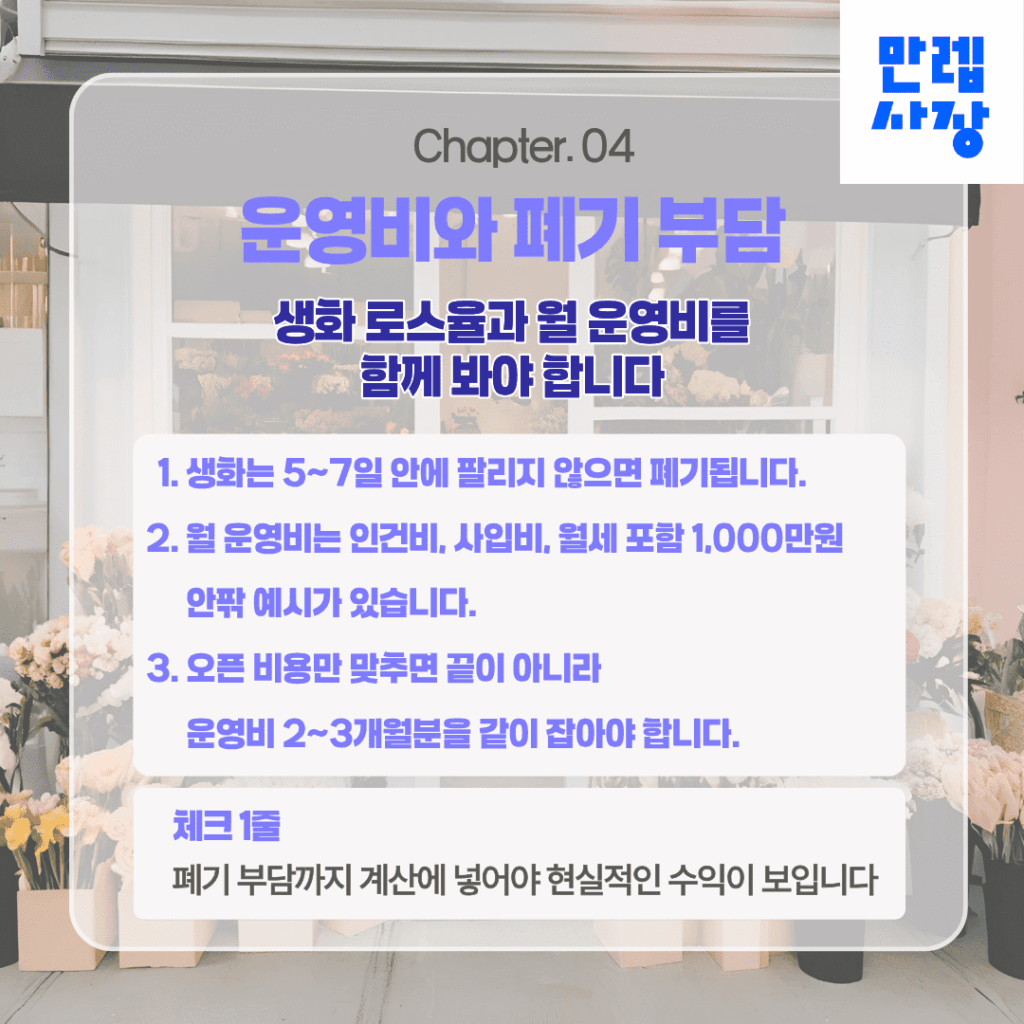 생화는 5~7일 안에 팔리지 않으면 폐기되며, 로스율이 수익 감소의 주요 원인이 됩니다.