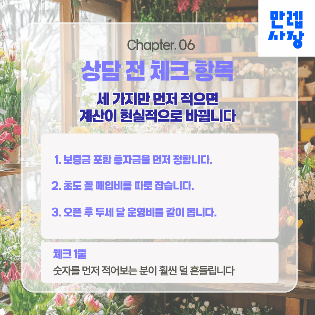 총자금, 월 운영비, 수익 다각화 품목 세 가지를 먼저 정리한 뒤 상담을 진행하시기 바랍니다.