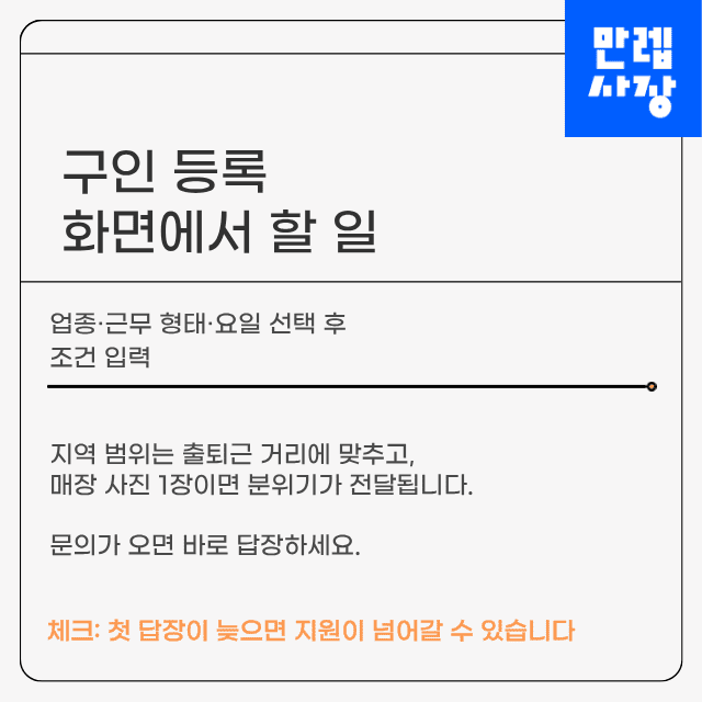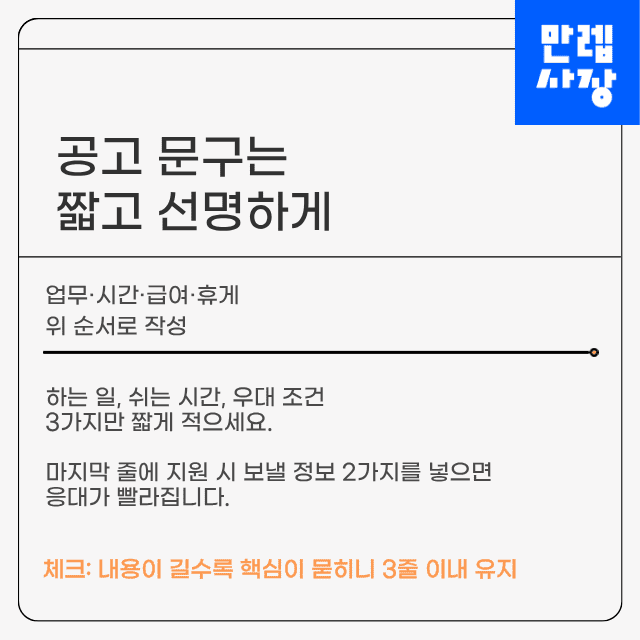 예를 들어 평일 마감 4시간, 포장과 정리 중심처럼 구체적으로 작성하면 조건에 맞는 지원이 들어오기 쉽습니다.