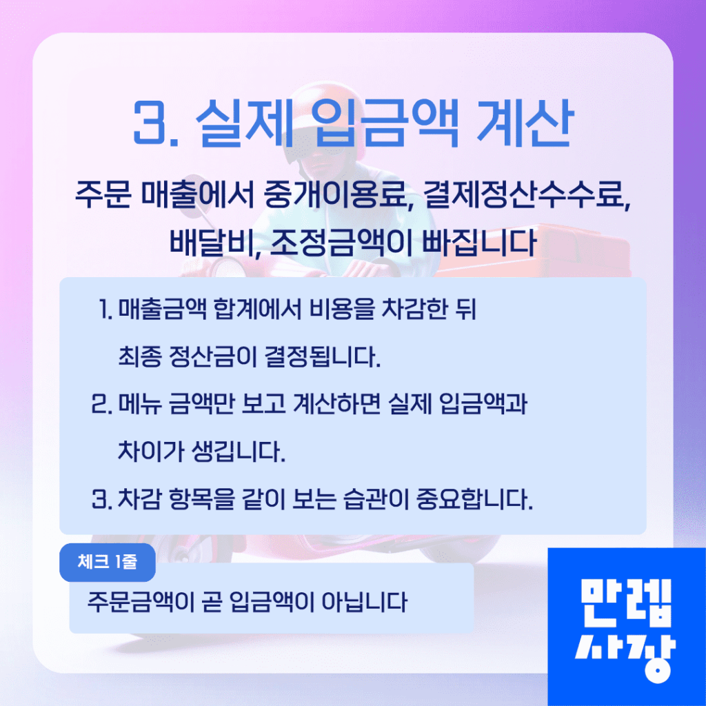 배민 정산은 주문금액이 그대로 입금되는 구조가 아니라 여러 비용이 차감된 뒤 최종 정산금이 결정되는 방식입니다.