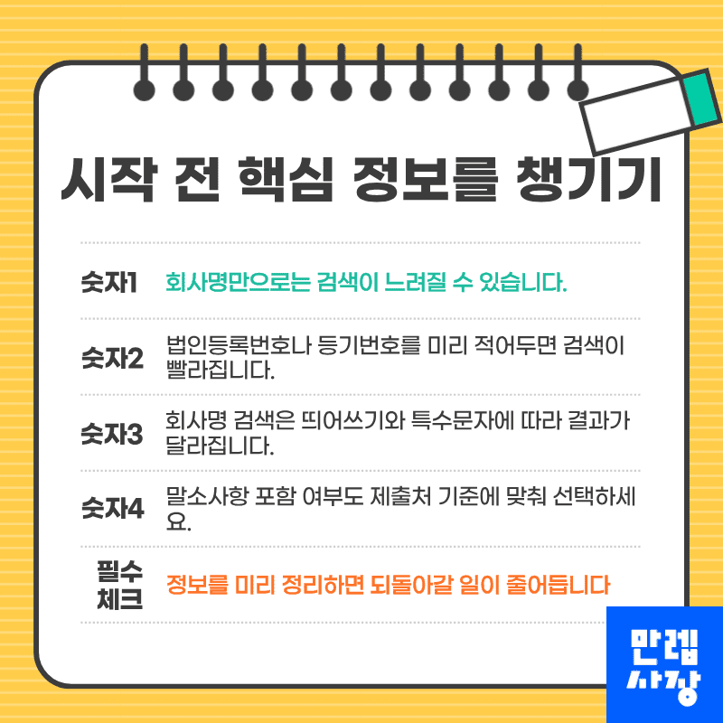 동일 상호가 존재할 경우 법인등록번호나 등기번호를 미리 확보해두면 검색 시간이 단축됩니다.