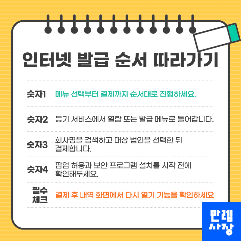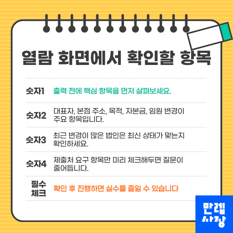 최근 변경이 많았던 법인이라면 최신 상태가 정확한지 살펴보고, 필요하면 재발급으로 이어가시기 바랍니다.