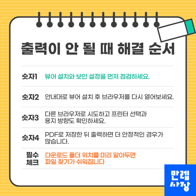 출력 오류의 주요 원인은 뷰어 미설치 또는 보안 설정입니다.
