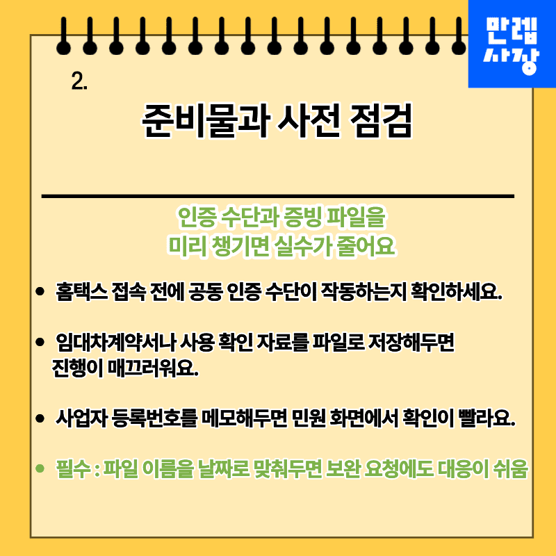 사업자 등록번호를 미리 메모해두면 민원 화면에서 확인이 빠르며, 파일명을 날짜 기준으로 정리해두면 보완 요청 시 재첨부가 수월합니다.