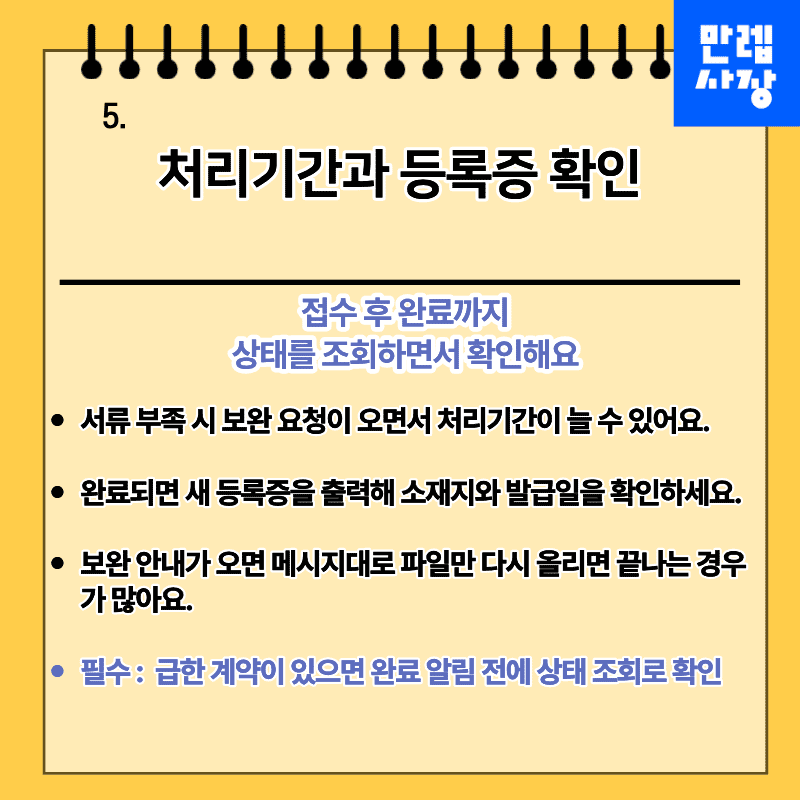 오늘 접수 번호 저장과 등록증 출력 확인까지 마무리해두면 이후 거래 서류 관리가 훨씬 수월해집니다.