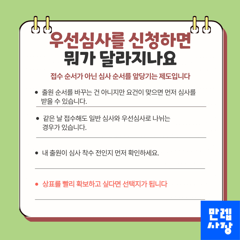 같은 날 접수하더라도 일반 심사로 진행되는 경우와 우선심사로 분류되는 경우가 나뉩니다.
