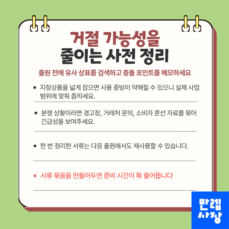 출원 전에 유사 표장을 검색하고 충돌 포인트를 정리해두는 것이 좋습니다.