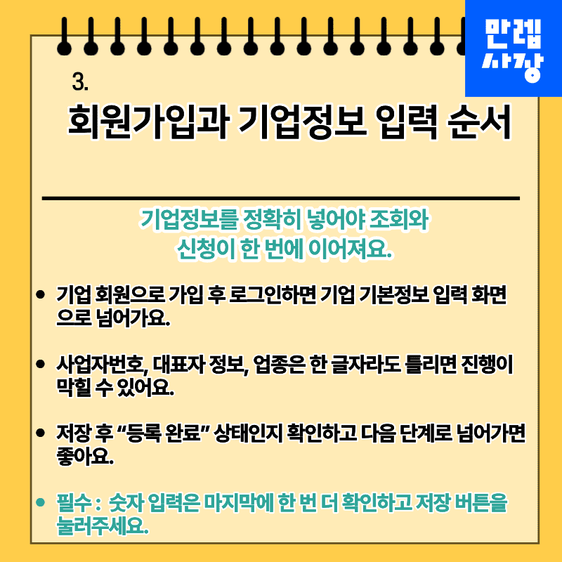 기업정보 입력 단계에서 사업자번호 및 대표자 정보를 정확히 기재합니다.