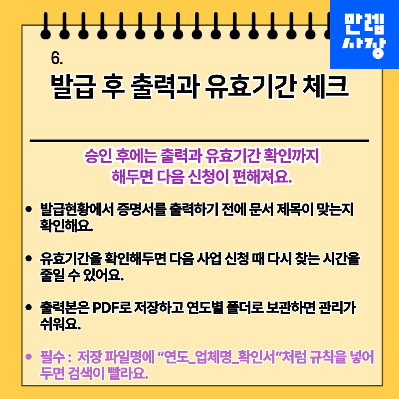 준비물 확인 → 기업정보 등록 → 자료제출 → 신청서 제출 → 출력 및 보관 순으로 진행하면 온라인 발급을 안정적으로 마무리할 수 있습니다.