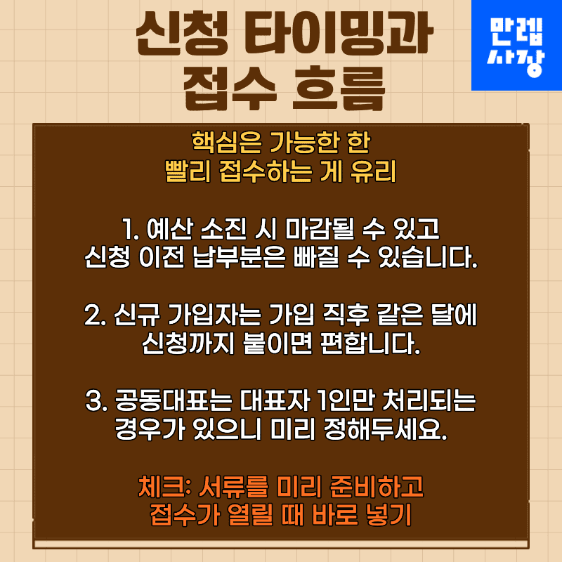 접수 타이밍을 놓치지 않도록 서류를 미리 준비하고, 월별 납부와 상태 확인을 습관화하면 안정적으로 유지할 수 있습니다.