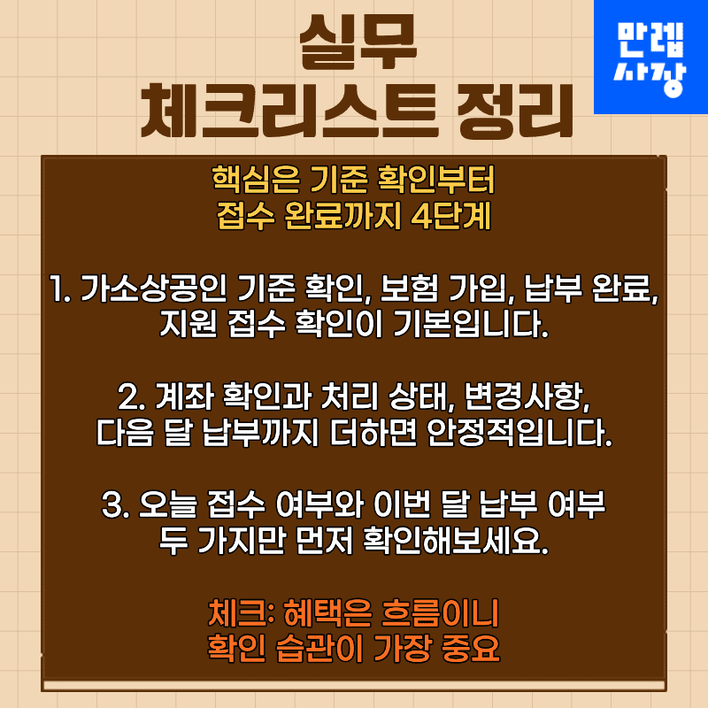 대상 조건 확인, 가입, 납부, 접수 네 단계만 잡아두면 소상공인 고용보험 지원 절차는 단순한 반복 업무가 됩니다.