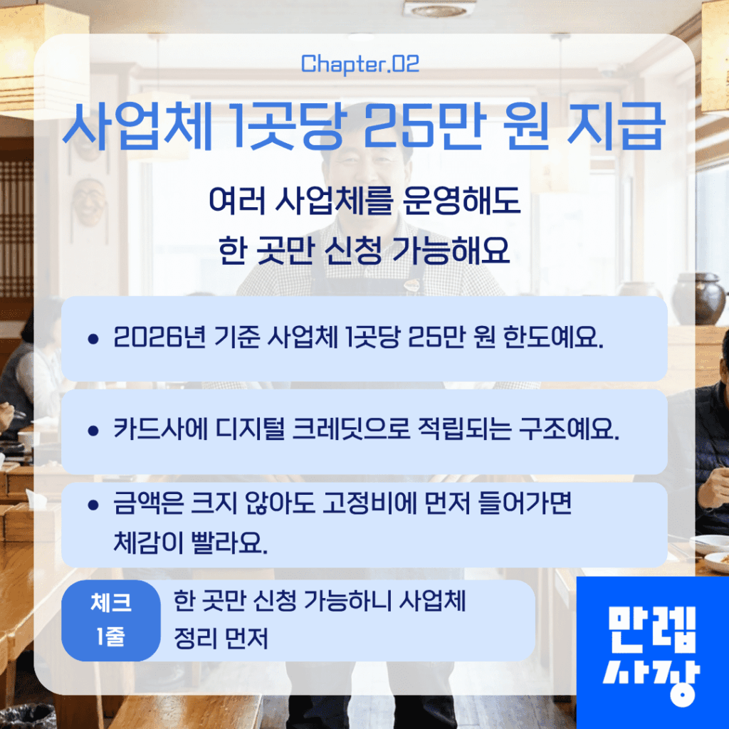 2026년 기준으로 사업체 1곳당 25만 원 한도로 지급됩니다.