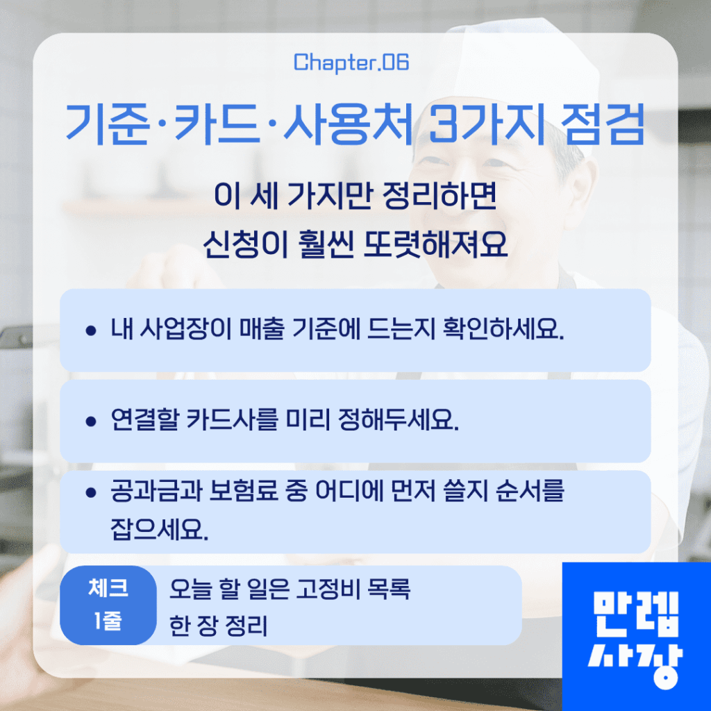 첫째 내 사업장이 매출 기준과 개업일 기준에 부합하는지, 둘째 소상공인 특별지원금을 연결할 카드사가 무엇인지, 셋째 공과금과 보험료 가운데 어디에 먼저 사용할지입니다.