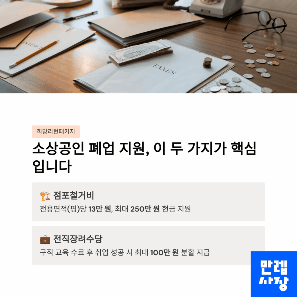정부에서는 폐업의 기로에 선 소상공인의 안전한 퇴로를 열어주기 위해 ‘희망리턴패키지’라는 이름으로 지원을 이어가고 있습니다. 오늘은 폐업지원금 신청방법부터 조건까지, 꼭 필요한 내용만 정리해 드립니다.