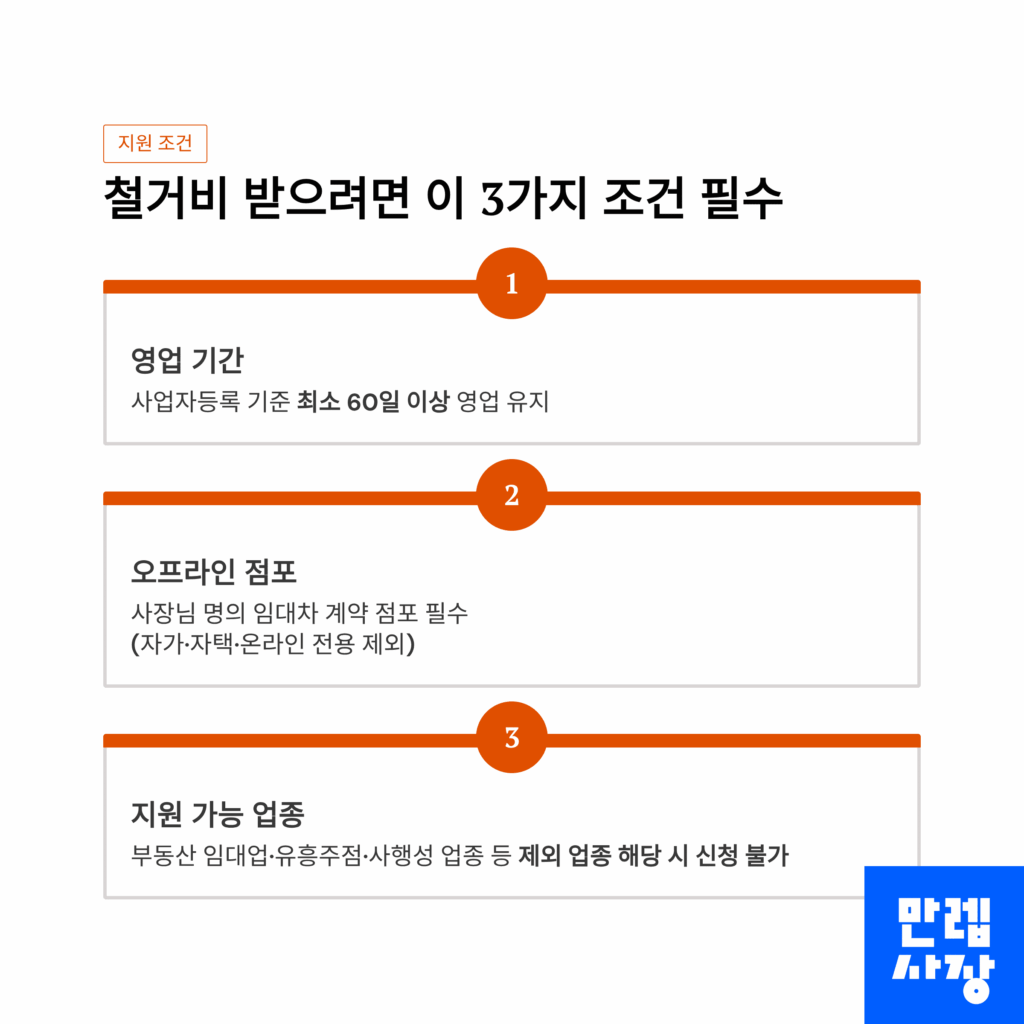 폐업하는 모든 매장이 철거비를 받을 수 있는 것은 아닙니다. 아래 요건을 모두 충족해야 신청이 가능합니다.