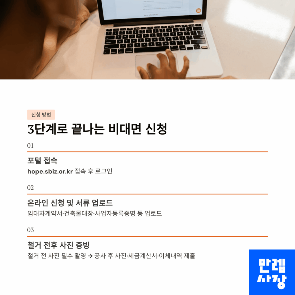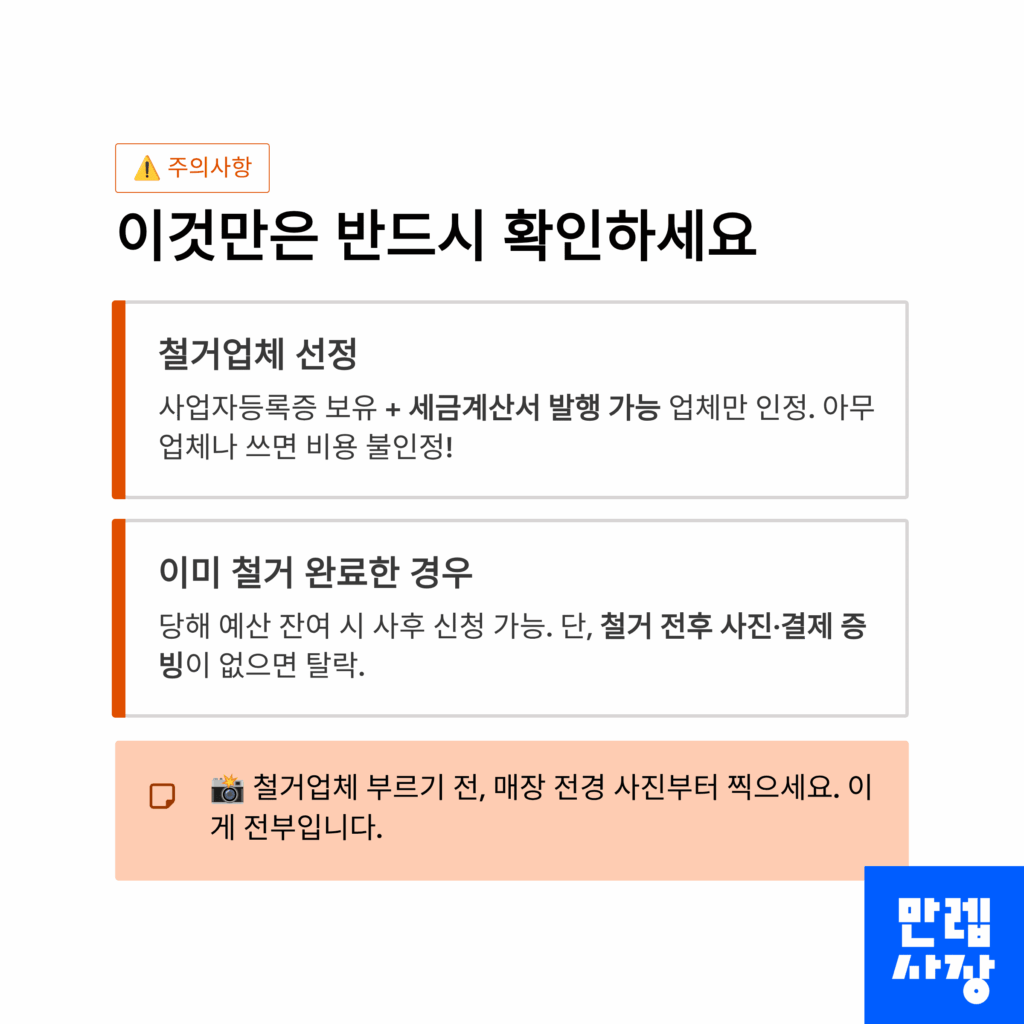 이미 철거가 끝난 경우 : 원칙적으로는 철거 공사 전에 신청하는 것이 안전하지만, 이미 폐업과 철거를 마쳤더라도 당해 연도 예산이 남아있고 철거 전후 사진과 결제 증빙이 명확하게 남아있다면 사후 신청도 가능합니다. 다만 사진 증빙이 부실하면 심사에서 탈락할 수 있으니 사진 확보가 무엇보다 중요합니다.