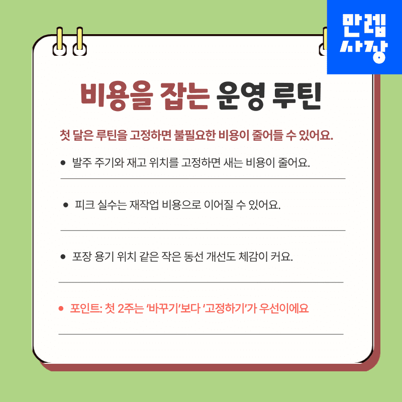 따라서 첫 달은 발주 주기와 재고 위치를 고정해 운영 변수를 줄이는 것이 효과적입니다.
