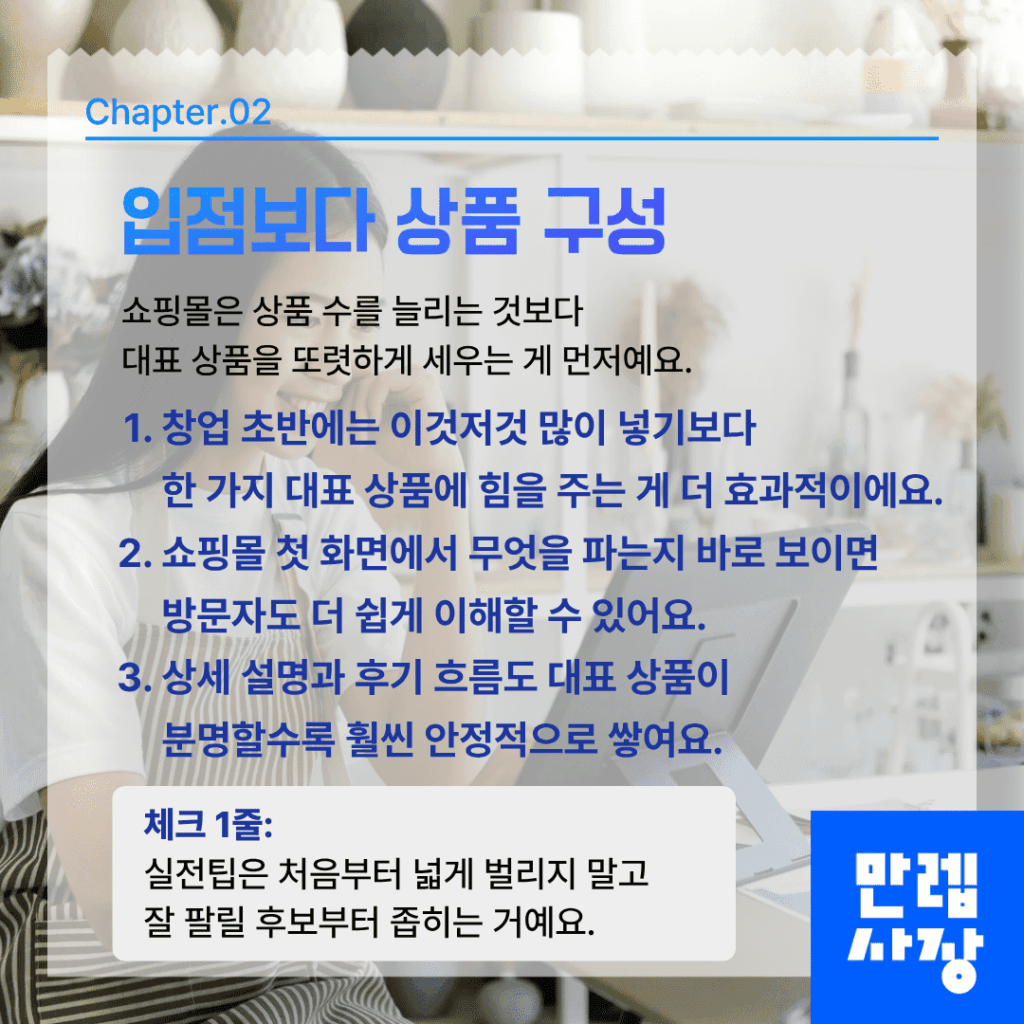 초반에는 상품 수를 늘리는 것보다 대표 상품을 분명하게 정하는 것이 우선입니다.