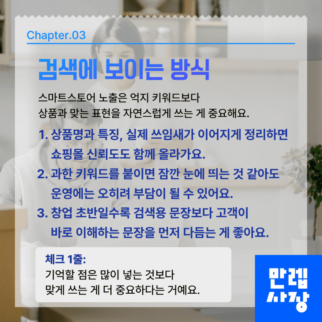 노출을 위해 키워드를 많이 넣는 것보다 상품과 맞는 표현을 자연스럽게 쓰는 것이 중요합니다.
