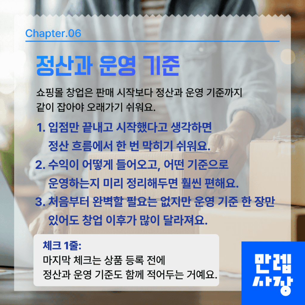 정산 확인 주기, 배송 기준, 고객 응대 기준 정도만 정리해도 운영 부담을 크게 줄일 수 있습니다.