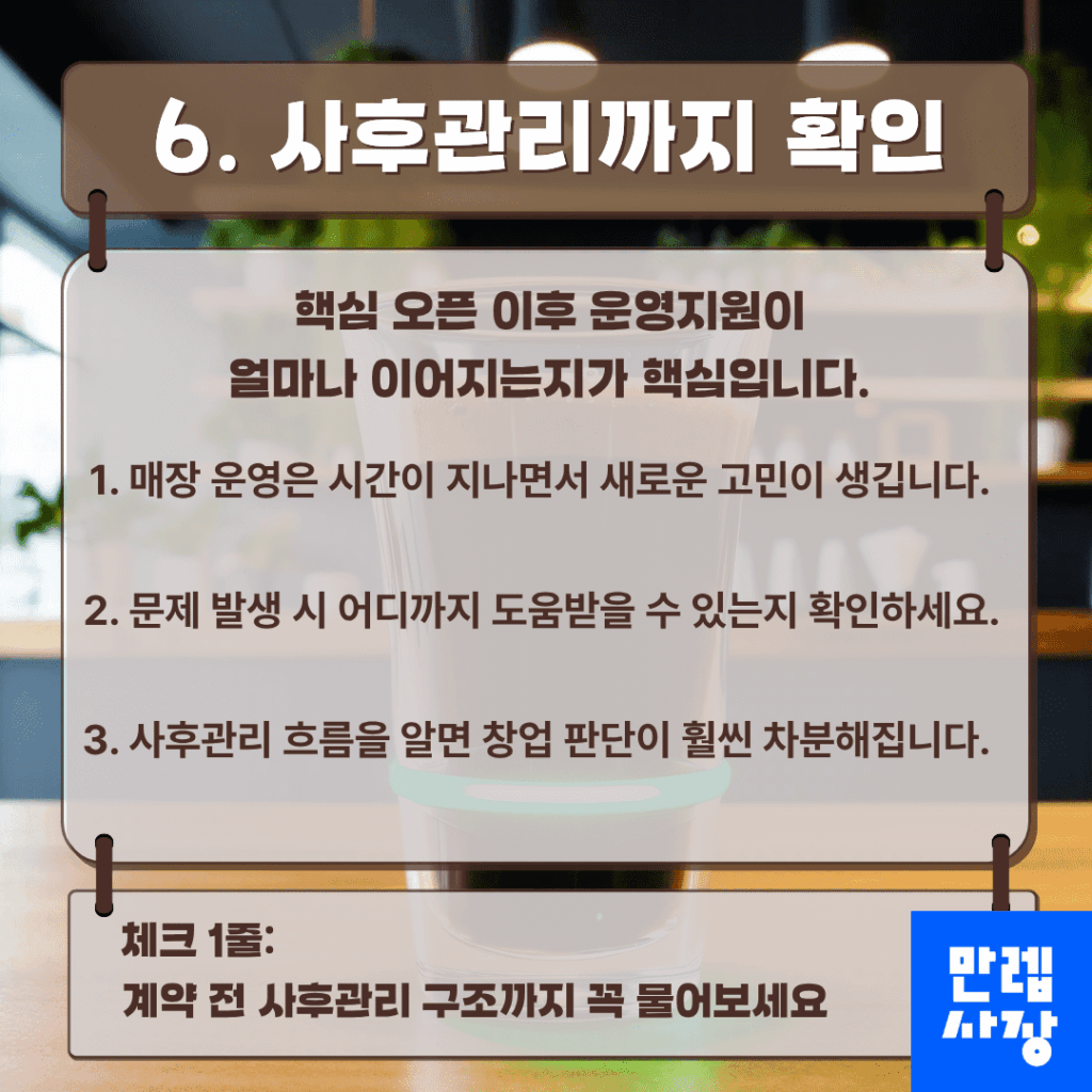 매장 운영은 시간이 지나면서 새로운 과제가 생길 수 있으며, 그때마다 어떤 방식으로 지원을 받을 수 있는지 사전에 확인해두면 창업 판단이 훨씬 안정적으로 이루어집니다.