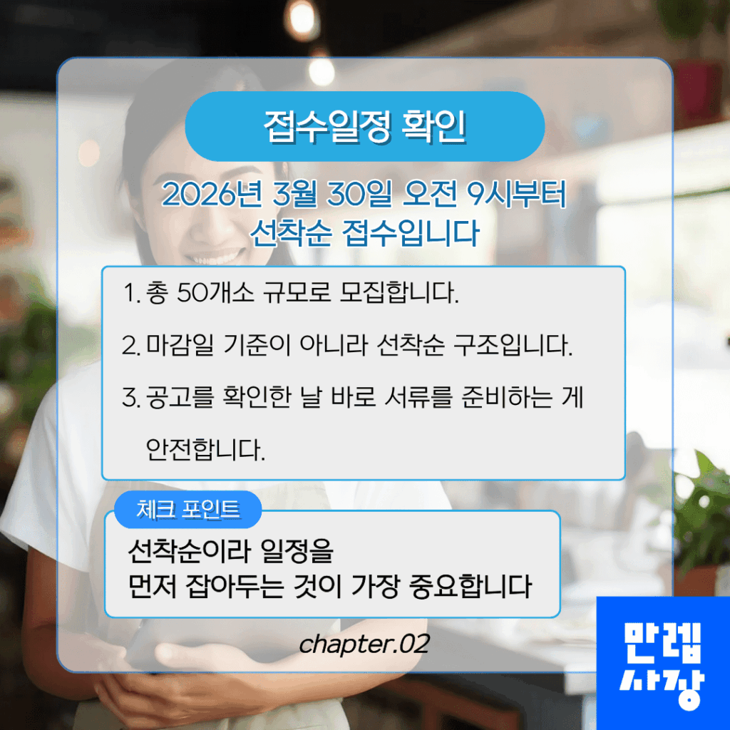 총 50개소 규모이므로 접수 시작 시점에 맞춰 준비를 완료해두는 것이 중요합니다.