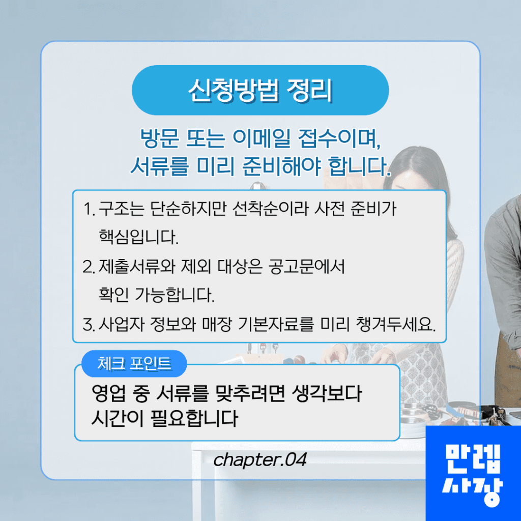 아래에서 신청대상, 접수일정, 지원내용, 신청방법, 적합 매장 유형, 신청 전 체크포인트를 순서대로 안내합니다.