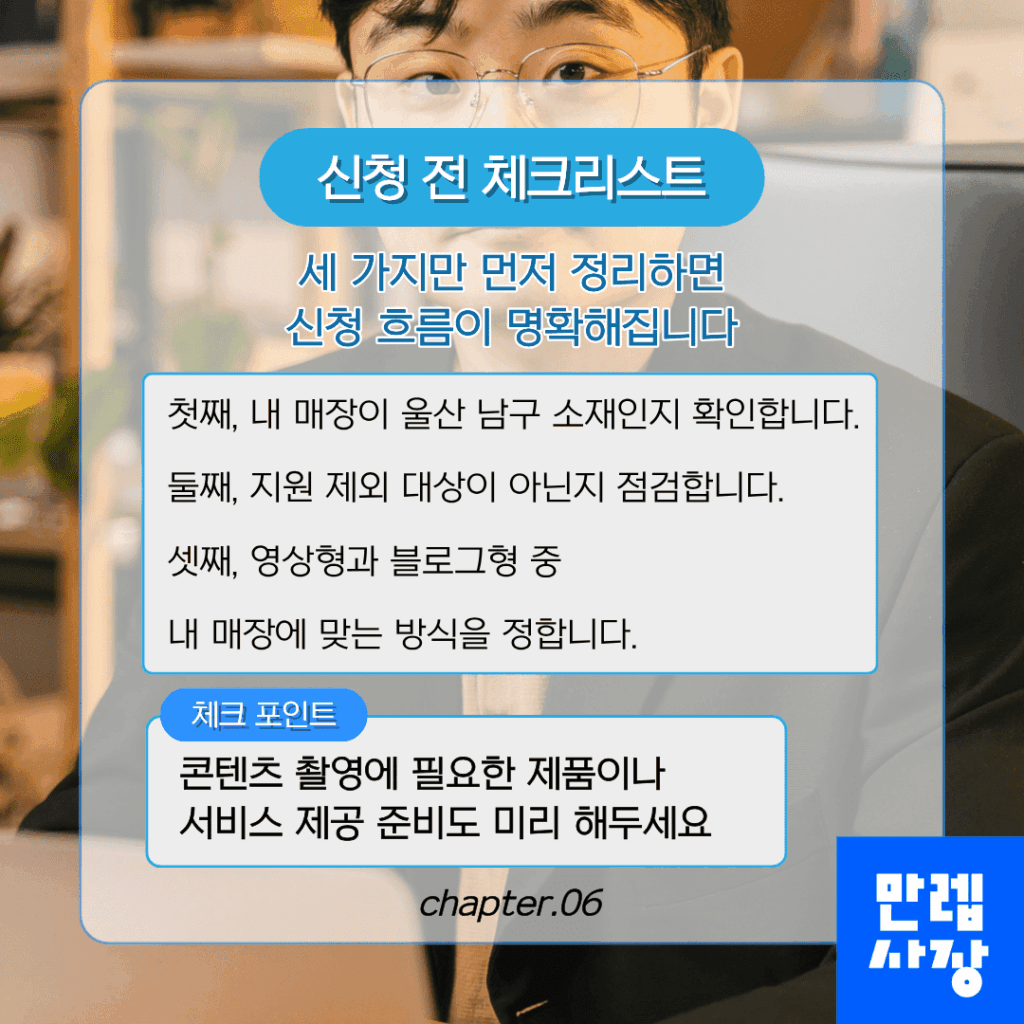 첫째 사업장이 울산 남구 소재인지, 둘째 지원 제외 대상이 아닌지, 셋째 영상형과 블로그형 중 내 매장에 적합한 방식이 무엇인지 확인하는 것입니다.