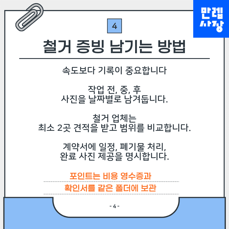 철거 후 비용 영수증과 확인서를 같은 폴더에 보관하면 이후 처리가 효율적입니다.