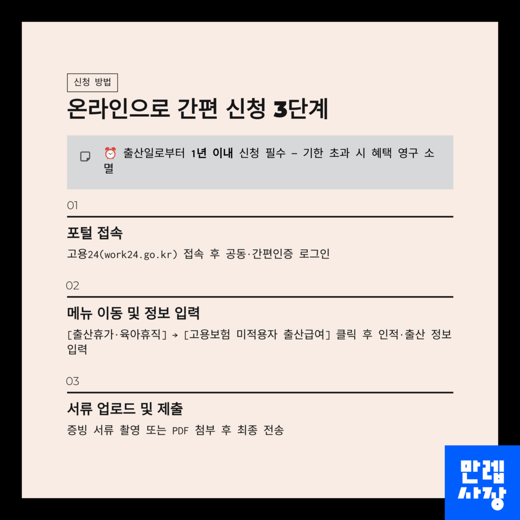 신청 기한은 출산일로부터 1년 이내입니다. 이 기한이 하루라도 지나면 혜택이 영구 소멸되므로 반드시 기억해 두세요.
