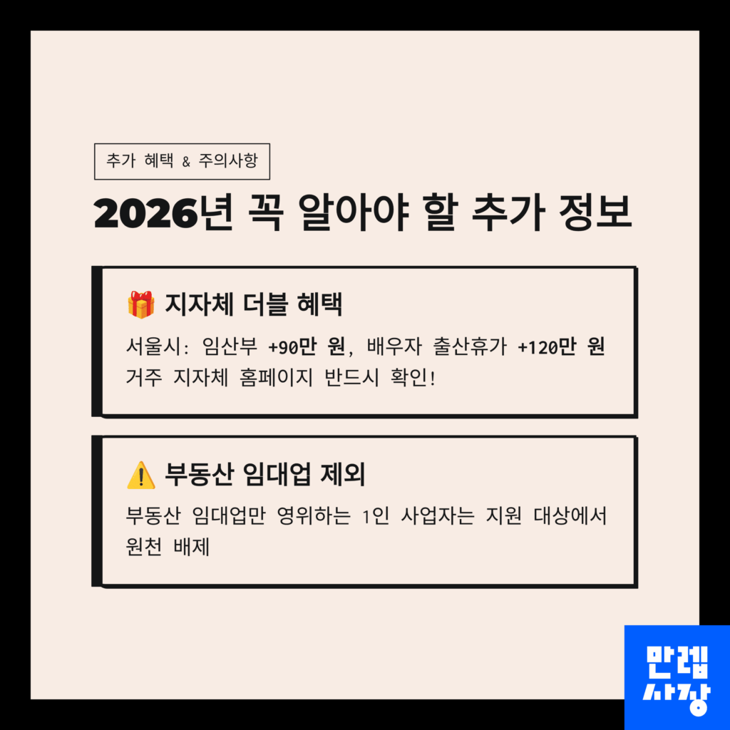 예를 들어 서울시의 경우 1인 자영업자·프리랜서 임산부에게 별도 90만 원을, 배우자에게는 출산휴가 급여 120만 원을 지원하는 제도를 운영 중입니다.