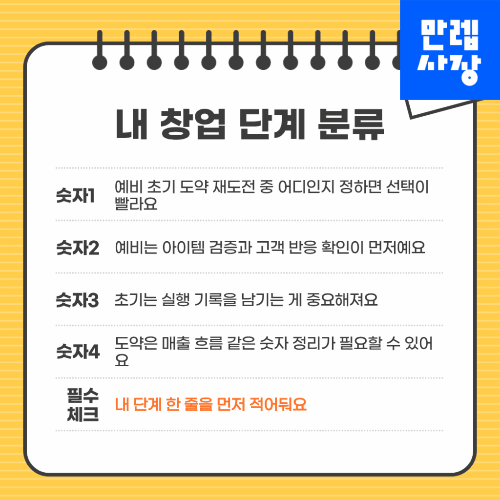 먼저 본인이 예비, 초기, 도약, 재도전 중 어디에 해당하는지 정리합니다.