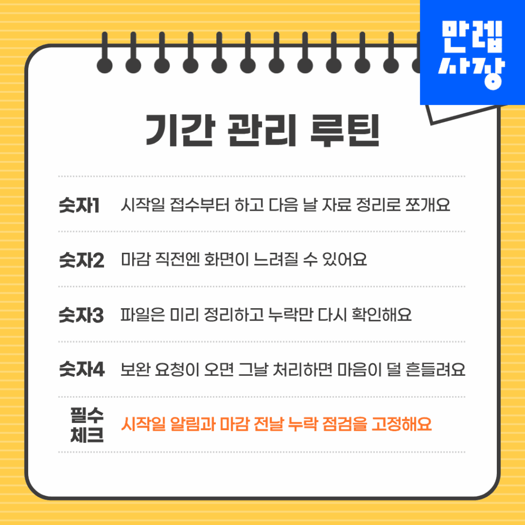 시작일에는 접수부터 완료하고, 다음 날 자료를 정리하는 방식으로 분리하면 마감 직전 혼선을 줄일 수 있습니다.