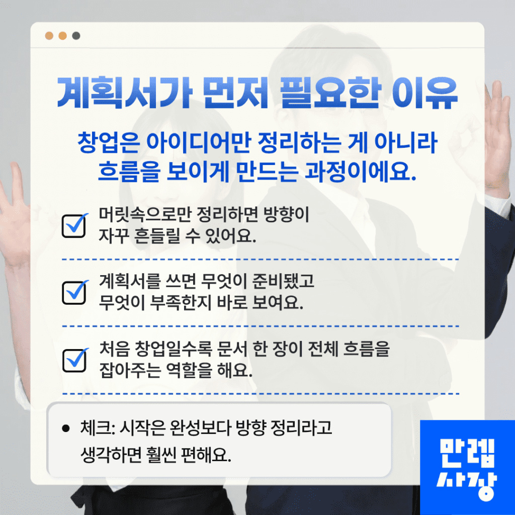 하지만 실제로는 계획서를 먼저 정리해야 사업 방향, 준비 수준, 실행 가능성이 더 분명하게 보입니다.