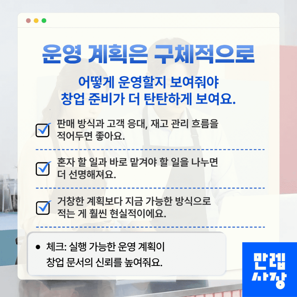 아이템, 고객, 수익 구조, 운영 계획을 순서대로 정리하면 처음 준비하는 경우에도 충분히 완성도 있는 구조를 만들 수 있습니다.