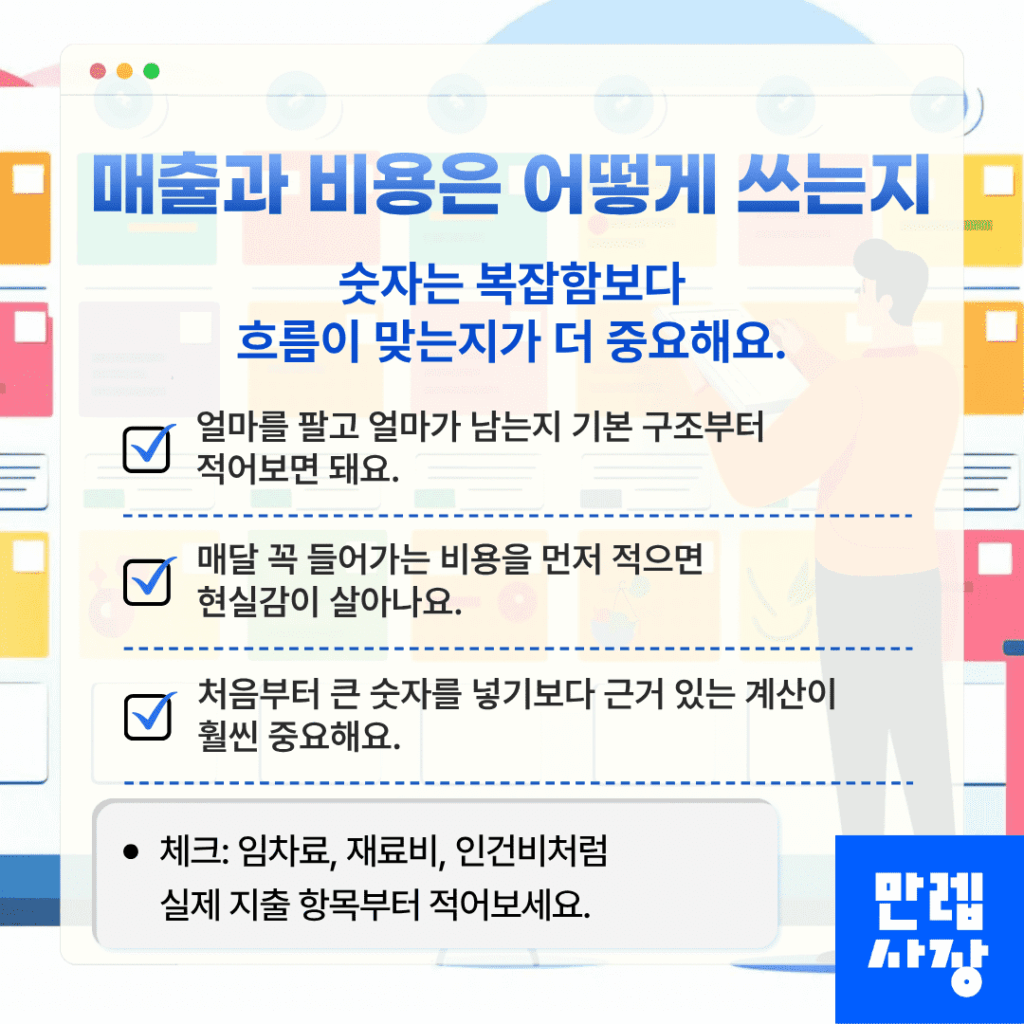 임차료, 재료비, 인건비, 홍보비처럼 반복적으로 발생하는 항목을 먼저 정리하는 방식이 실무적으로 유리합니다.