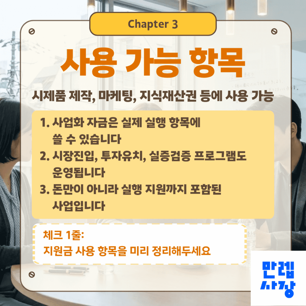 사업화 자금은 시제품 제작, 마케팅, 지식재산권 출원 및 등록 등의 항목에 사용할 수 있습니다.