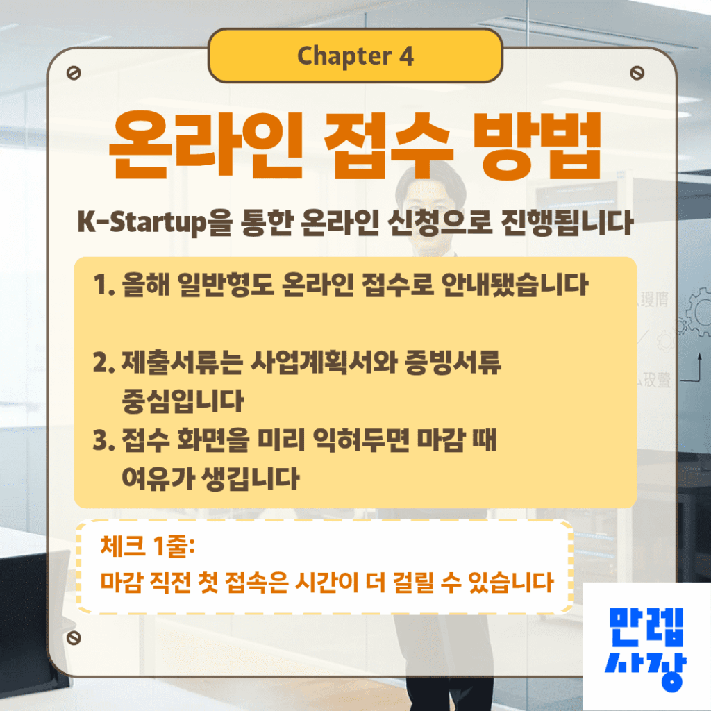 신청은 K-Startup을 통한 온라인 접수로 진행됩니다.