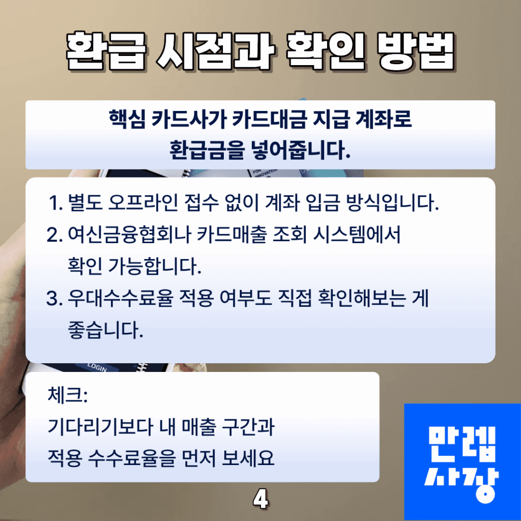해당 조건에 부합하면 카드대금 지급 계좌로 차액이 환급되는 구조이므로, 고정비 부담을 실질적으로 줄이는 데 도움이 됩니다.