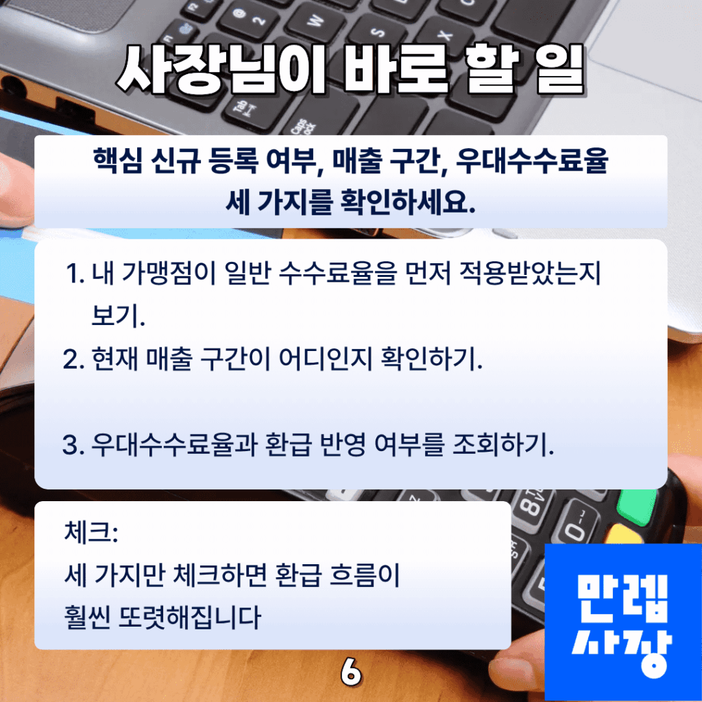 첫째 내 가맹점이 신규 등록 이후 일반 수수료율을 먼저 적용받았는지, 둘째 현재 매출 구간이 어디인지, 셋째 우대수수료율과 환급 반영 여부입니다.