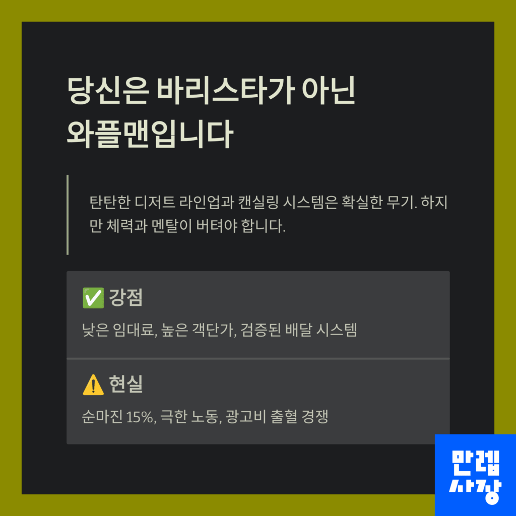 쏠쏠해 보이는 배달 매출 뒤에는 배달 플랫폼의 무시무시한 수수료랑 하루 종일 와플 기계 앞에서 씨름해야 하는 극한의 주방 노동이 숨어있거든요.