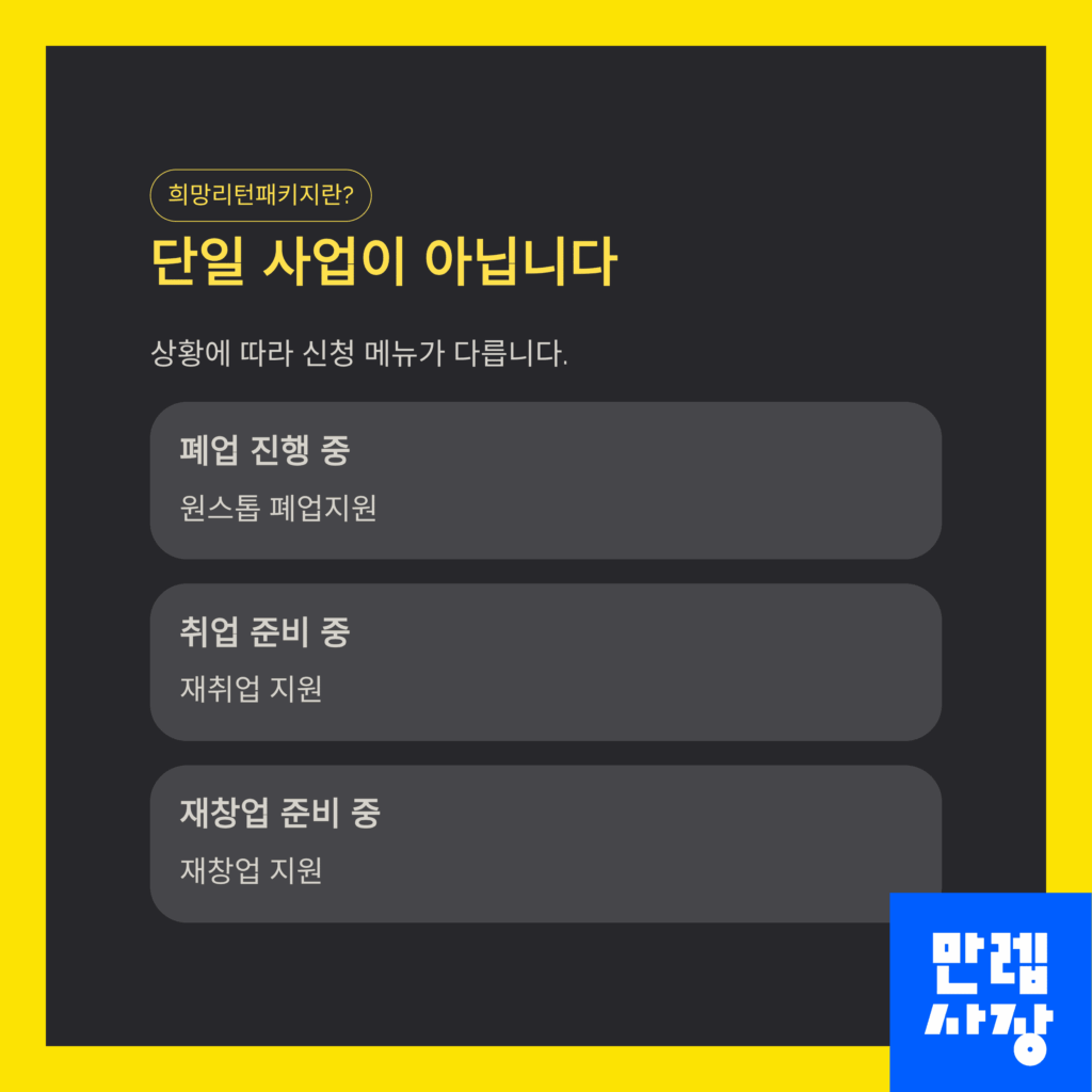 희망리턴패키지는 단일 프로그램이 아닙니다. 현재 상황에 따라 신청해야 하는 메뉴가 달라지기 때문에 어떤 지원이 필요한지 먼저 파악하는 것이 첫 번째입니다.